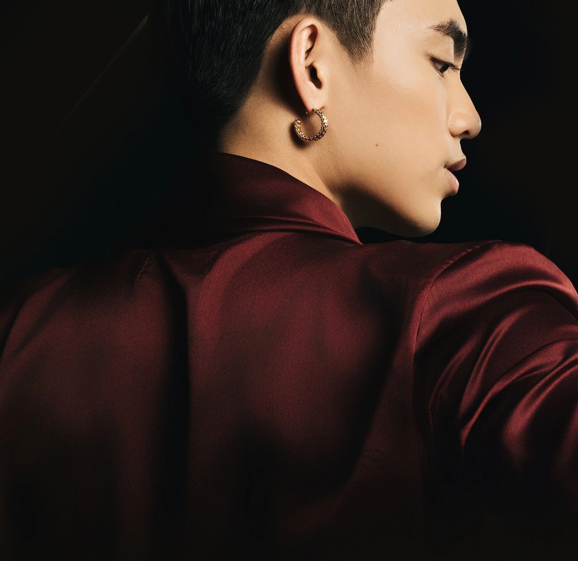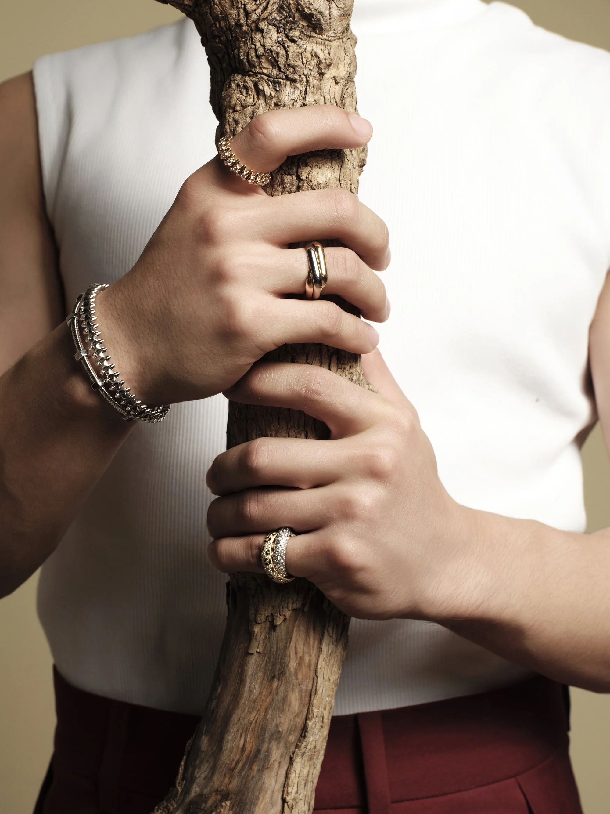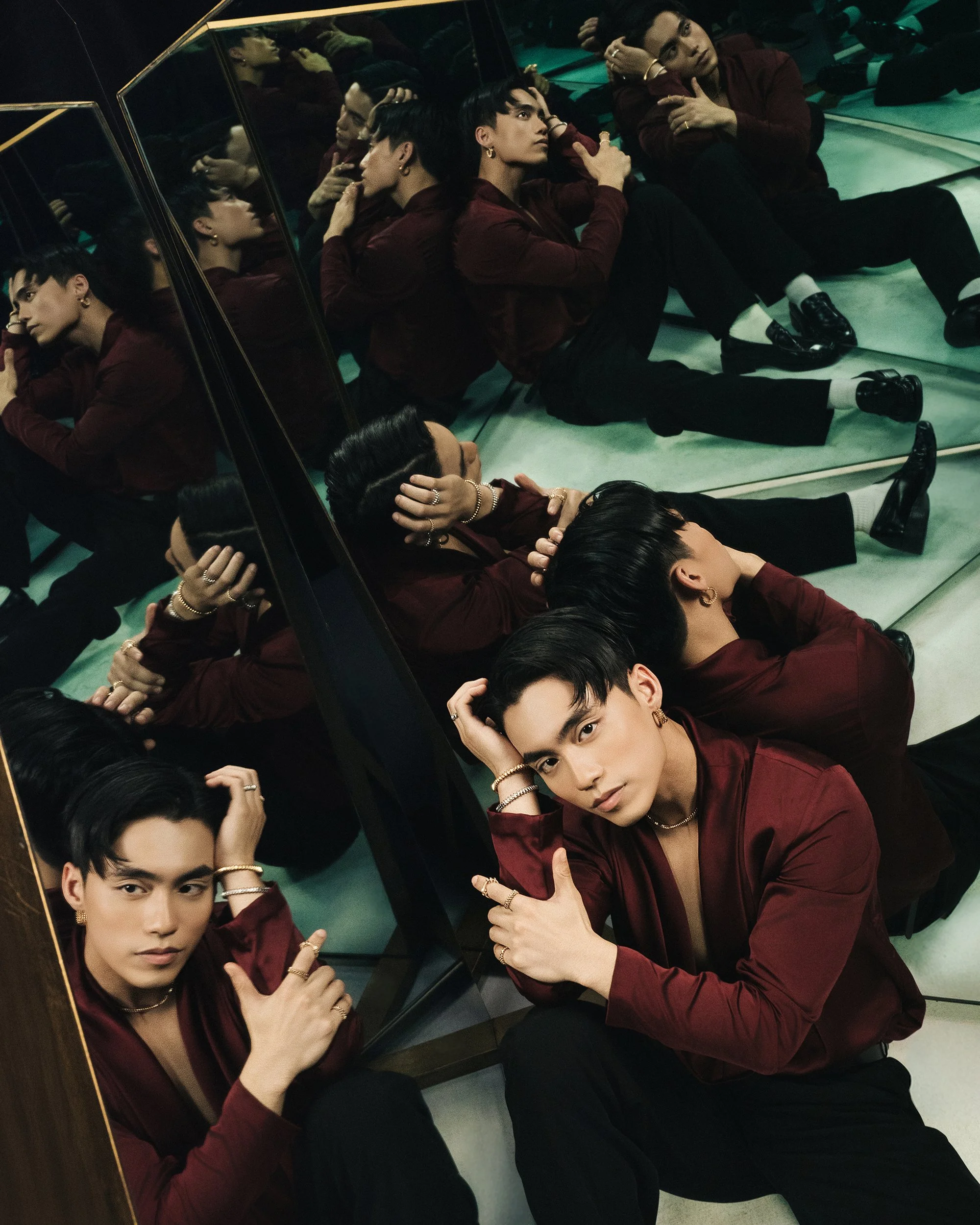 For the first set design, a mirror-driven set explored contrasting identities, using layered reflections and dynamic lighting to magnify the jewelry and emphasize the duality of elegance and edge that ‘Clash’ Collection is well known for.